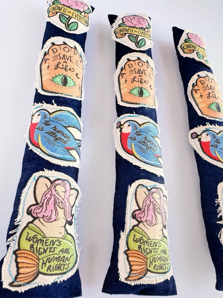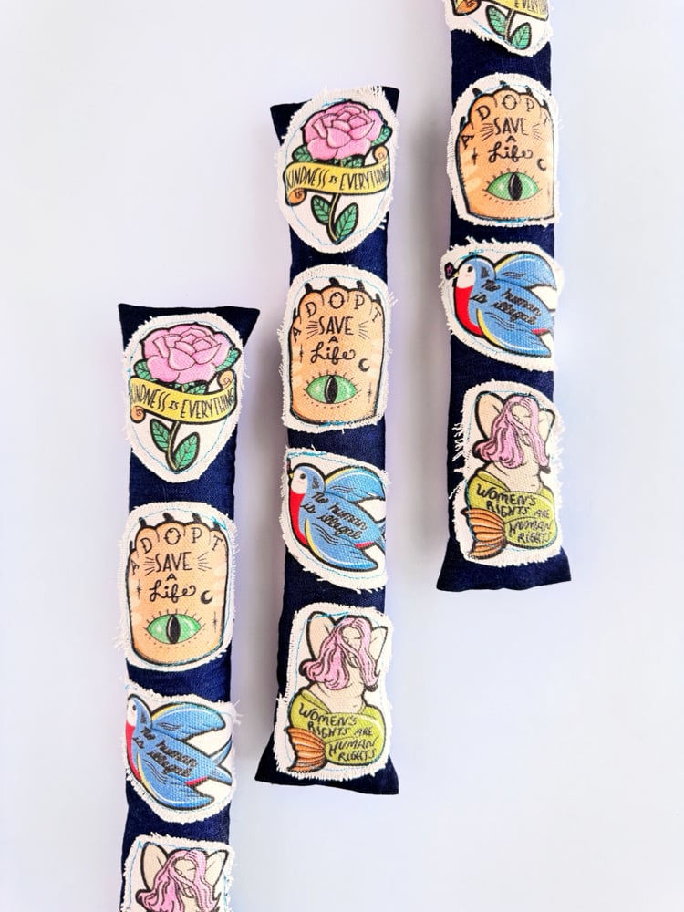 This large kicker cat toy is packed with a powerful blend of silver vine and catnip and features stitched on tattoo patches that say: