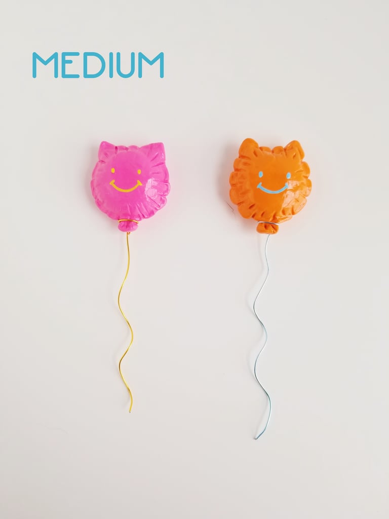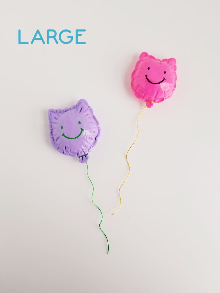There are 3 different sizes and each clay sculpture has a sculpted opening in the back that can be used for hanging on the wall. Each balloon also comes with aluminum wire in place of a ribbon in a complementing color.