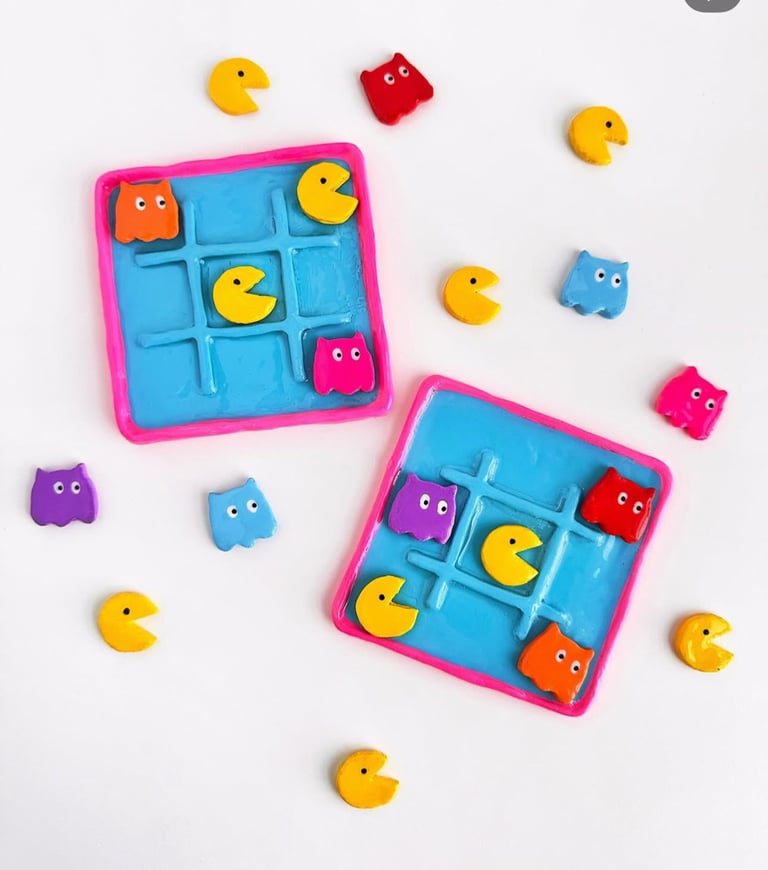 Step into a playful mix of retro arcade nostalgia and feline fun with Tic-Tic-Purr, a unique clay sculpture that doubles as a tic tac toe game. This compact 4-inch square set features 11 handcrafted pieces: a base square game board, five bright yellow Pac-Man inspired figures, and five ghost pieces, each topped with adorable cat ears.